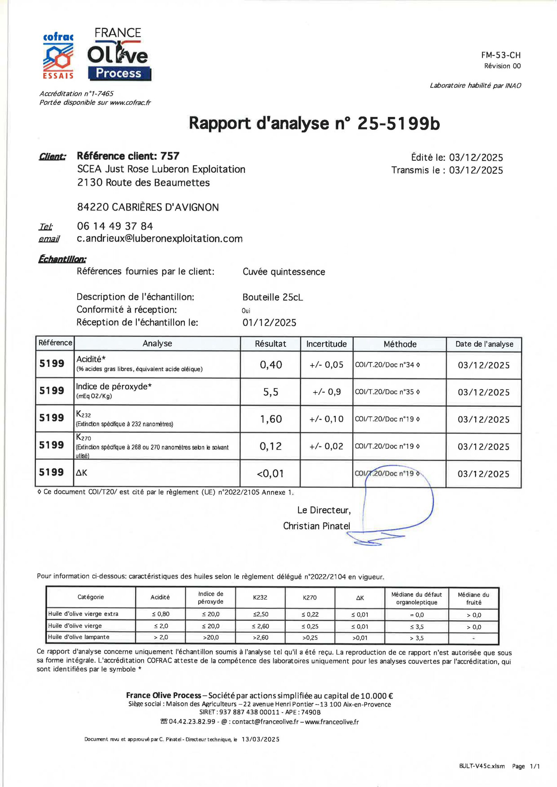 Chaque récolte du Domaine est soumise à des analyses complètes réalisées par le Centre Technique de l’Olivier à Aix en Provence.